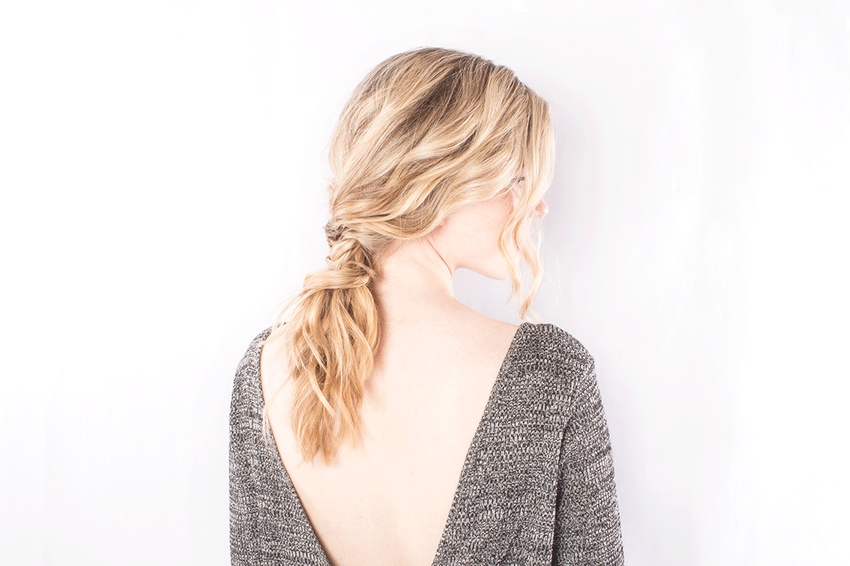 Betsy Hair Tip: Create a loose side fishtail. Braid the fishtail loosely by pulling pieces of hair gently from one side to the next while braiding.