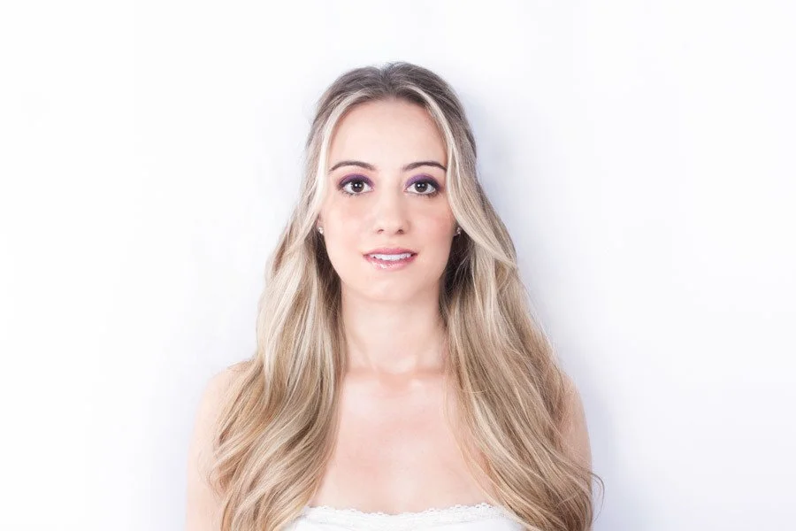 A colorful smokey makeup look is the perfect showcase for big beautiful eyes! Elisa used a deep purple at her lash line, which was blended out to a lighter purple into the crease. A little trick Elisa suggest in preventing shadow fallout (to keep the shadow in it's place) is to dip your makeup brush into a bit of a water, and then apply. This technique also increases the pigmentation of the shadow for your eyelids.