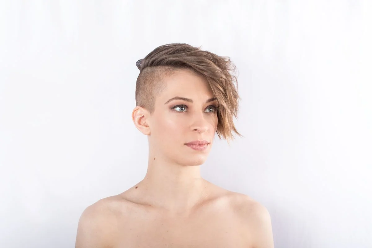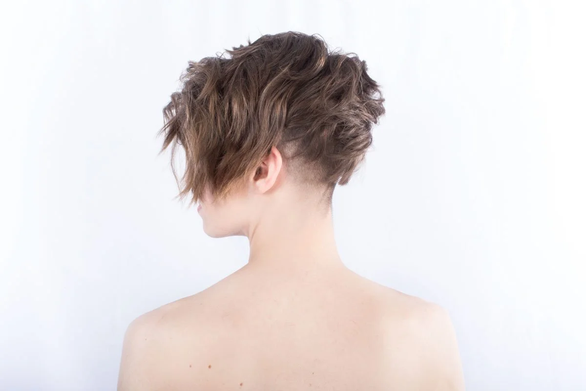 After shaping and shaving Jennie's hair around the sides and the back, there was still plenty left over for Betsy to style into this texturized look you see above (which was created using a curling rod) – Book your haircut with Betsy Elisa Beauty.
