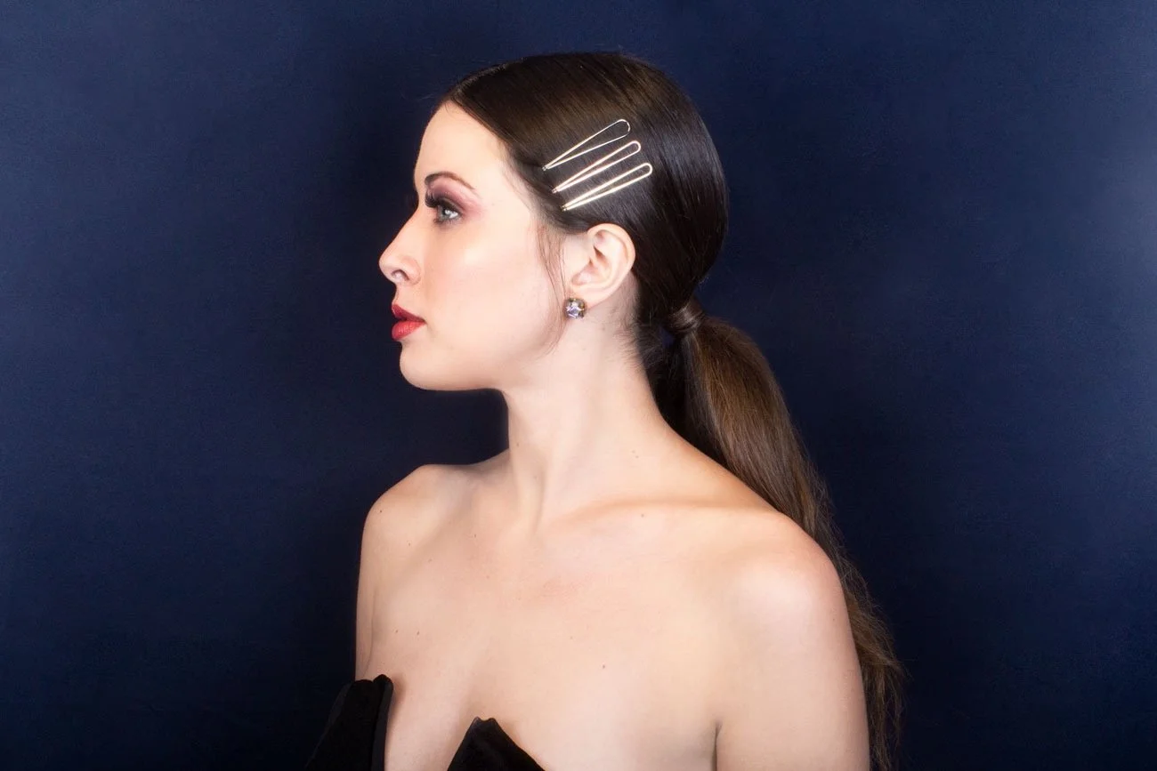 Starting off this look, Natasha pulled model Kate’s hair back into a neatly brushed ponytail. Natasha used a textured BB creme to give Kate’s hair a boost of volume. She perfected the style with an Elnett Satin hairspray from L’Oreal Paris, available at most drug stores.